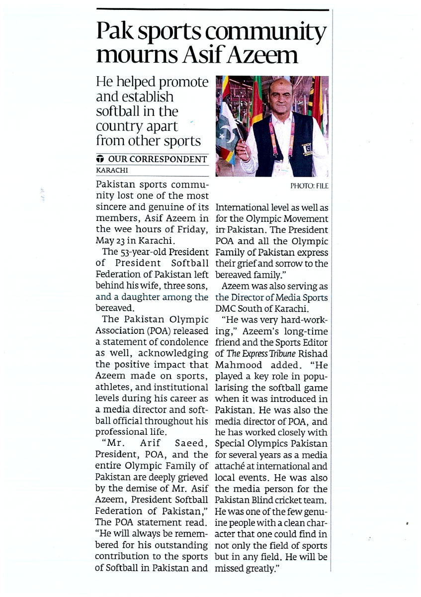 The president of Softball Asia and the softball community of the world at large, express their deepest condolences on the demise of the President of Softball Federation of Pakistan SFP, Asif Azeem, recently.